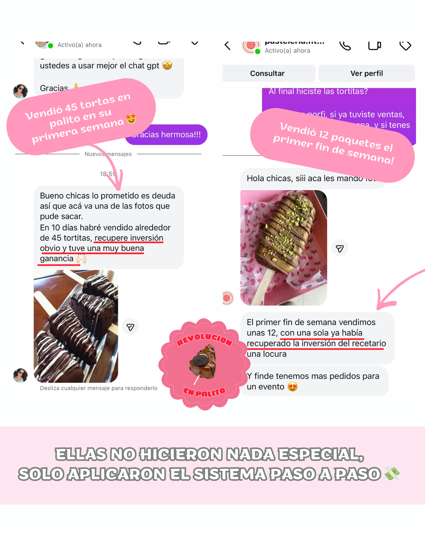 "El Secreto del Negocio en Palito" que es el manual completo donde aprendés paso a paso cómo emprender desde cero; y "35 Recetas Gourmet de Tortas en Palito"